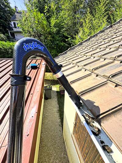 Le nettoyage est réalisé à l’aide d’un aspirateur professionnel à gouttières équipé d’une caméra, permettant d’éliminer efficacement feuilles et débris tout en contrôlant visuellement le résultat. Cette méthode permet d’intervenir depuis le sol dans la majorité des cas, sans monter sur le toit.